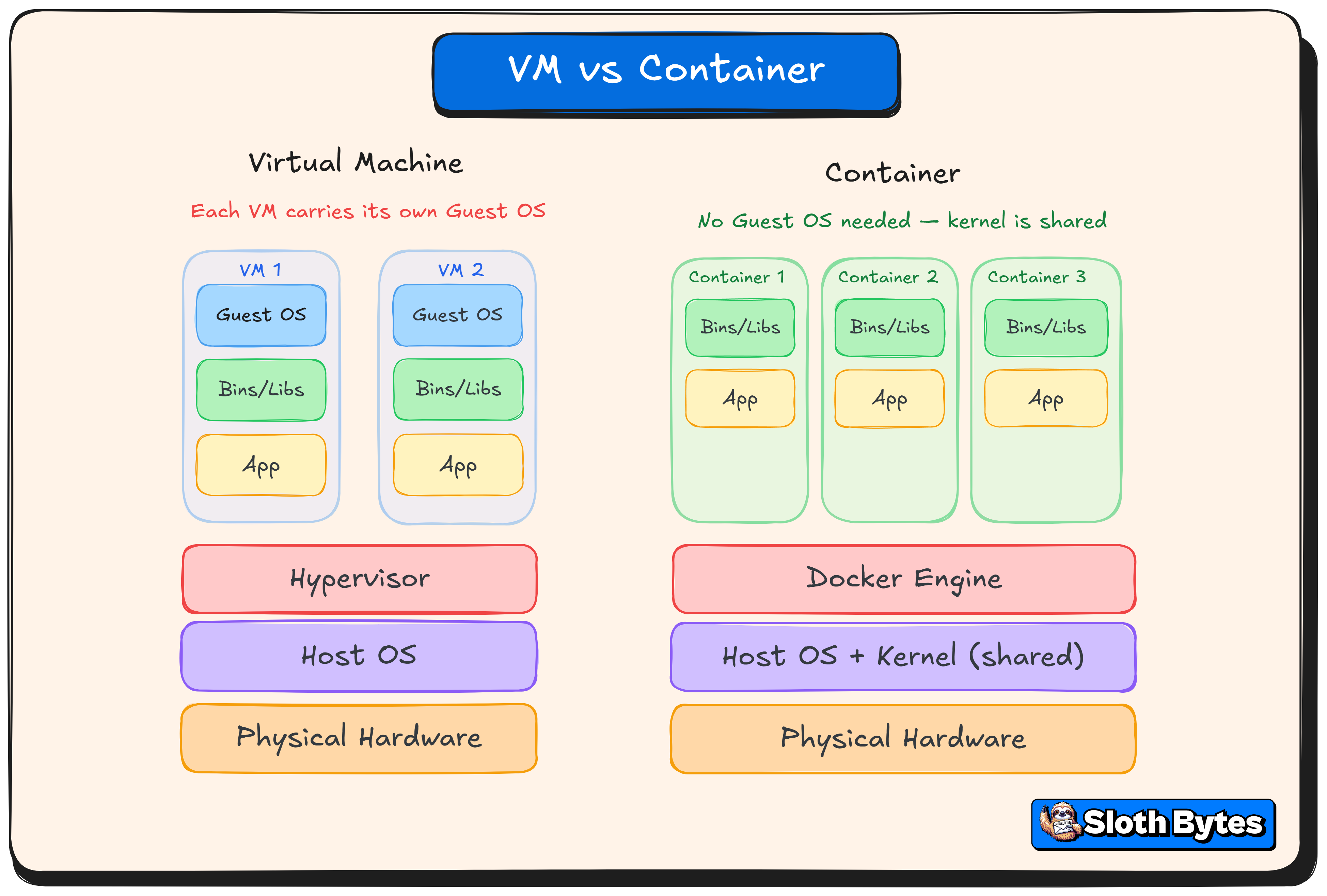 A VM emulates an entire computer. This means it emulates its own operating system, its own hardware, everything. It's heavy, slow to start, and eats RAM like it's not $1000 (Thanks AI).
